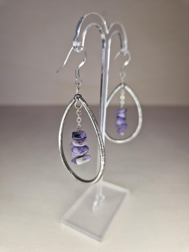 Charoïte. Résolution, énergie. Rend serein, dépassement contrainte, résistance. Aide la prise de décision importantes, faire face à une montagne de travail. Calme nerfs, atténue douleur, crampes.