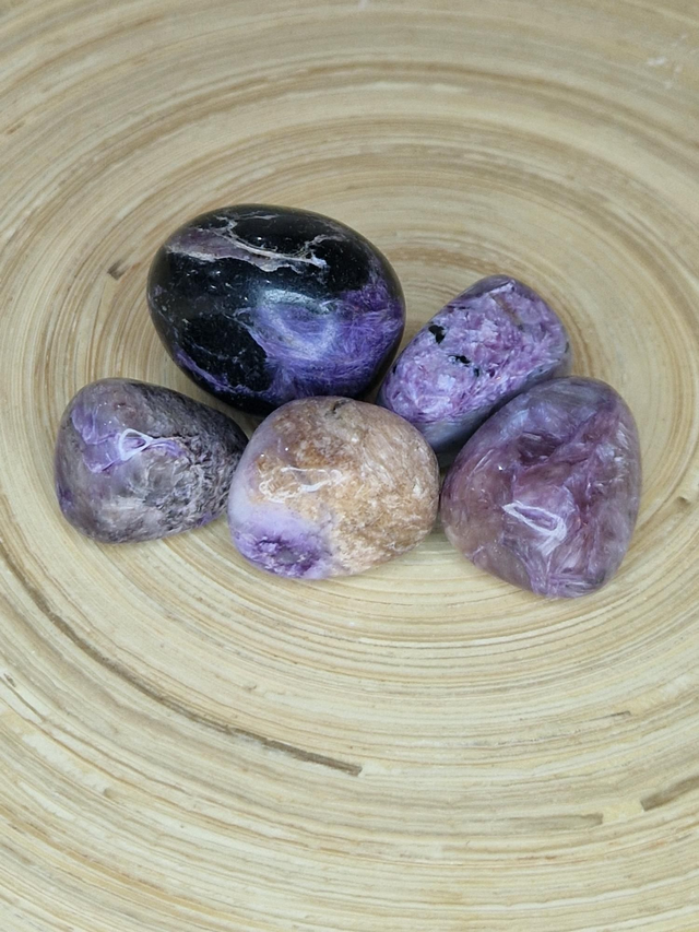 Charoïte. Résolution, énergie. Rend serein, dépassement contrainte, résistance. Aide la prise de décision importantes, faire face à une montagne de travail. Calme nerfs, atténue douleur, crampes.
