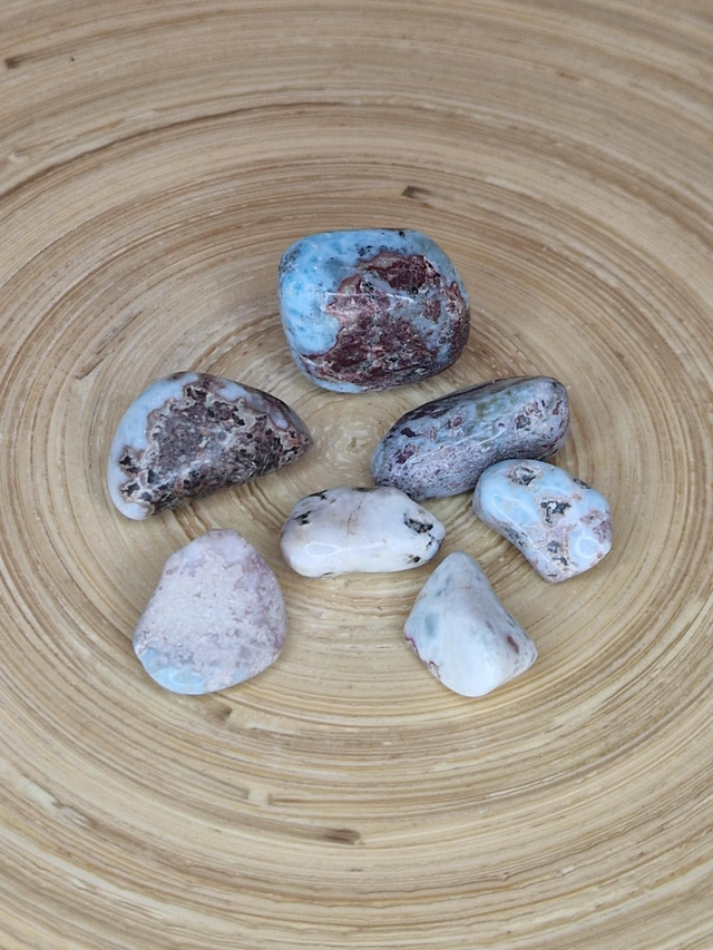 Larimar. Franchise, ouverture. Aide à agrandir espace spirituel, à le délimiter et assimiler impression accumule. Elargit perception. Stimule activité cérébrale et sensibilité, apaise douleur de poitrine, gorge, tête.