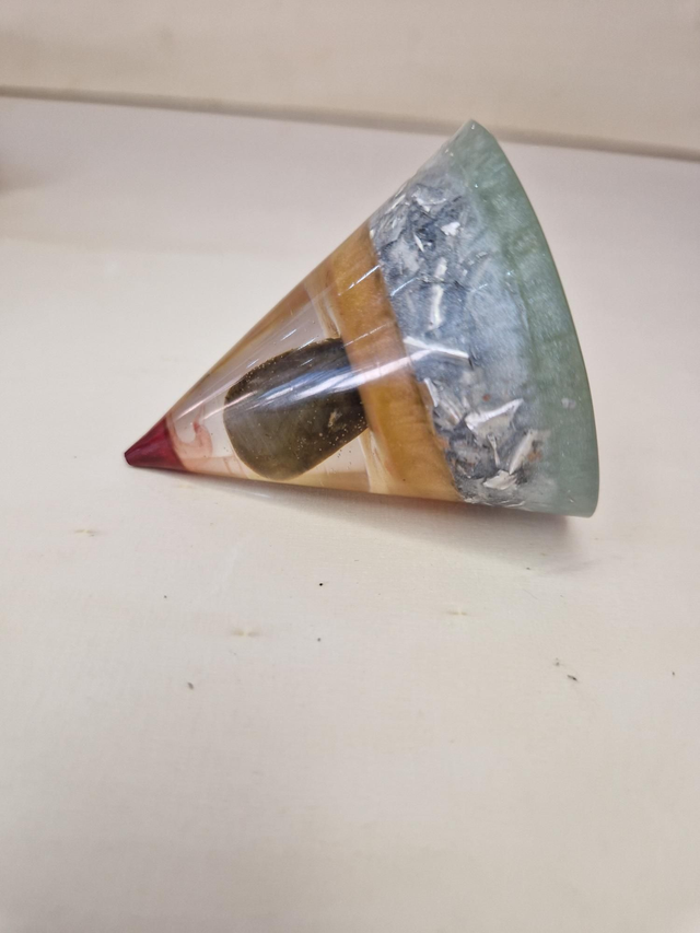 Orgonite. Absorbe le négatif par le métal, le transforme par le cristal en positif et laisse rayonner. Placée où un effet est souhaité : zones où une énergie stagnante et toxique ne veut pas partir ; appareils électronique, routeurs WiFi, ordinateur (à la base, créées pour neutraliser ondes électromagnétiques nocives pour la santé); près lit pour aider sommeil; zones passage; près nourriture; sur le corps ; etc.... Charge en positif : eau; aliments; huiles essentielles; homéopathie; cristaux; pendule, cartes, etc.... Le soleil rend la résine opaque.