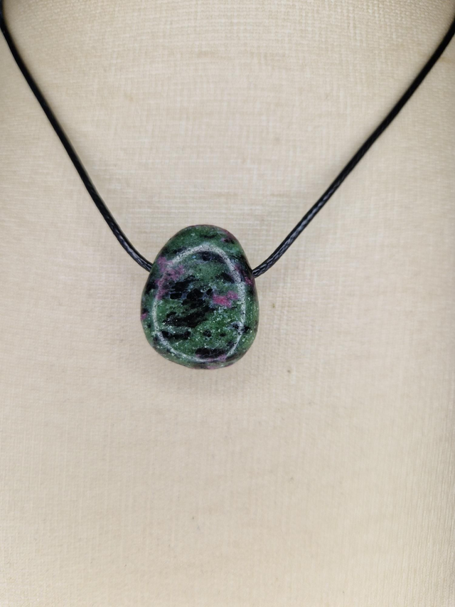 Zoïsite avec Rubis. Dynamique, régénération. Fait resurgie sentiments enfouis, stimule puissance sexuelle. Favorise engagement créatif. Désacidifie, régénère et stimule fécondité, trouble rate, prostate, testicules, ovaires.